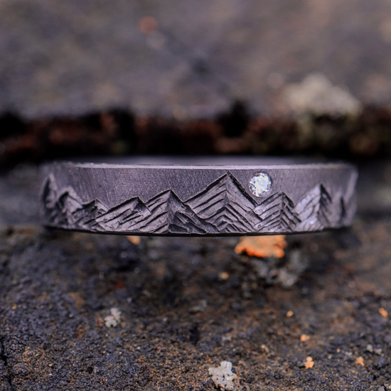 Hand carved mountain range on black zirconium, featuring a textured background and a 1.3mm eco friendly, lab created diamond.