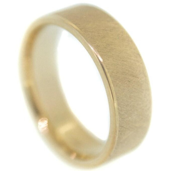 Flat outer profile with beveled edges and a brushed satin finish. Solid gold band and interior comfort fit.