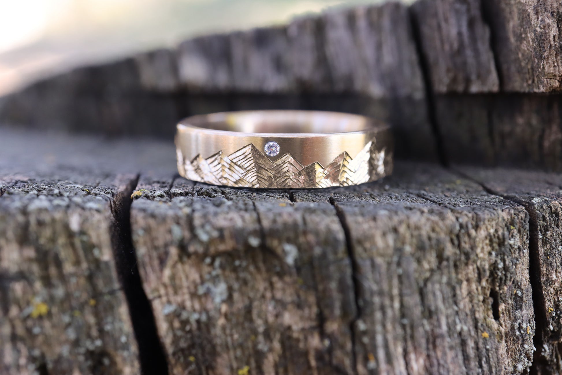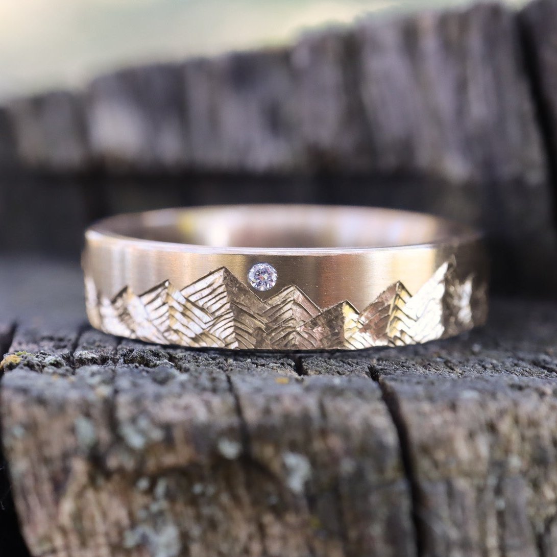 A breathtakingly beautiful 4mm ring with a hand-carved mountain range encircling it. Each mountain is uniquely crafted, no two are alike! 1 - 1.3mm lab-created diamond sits between the peaks.