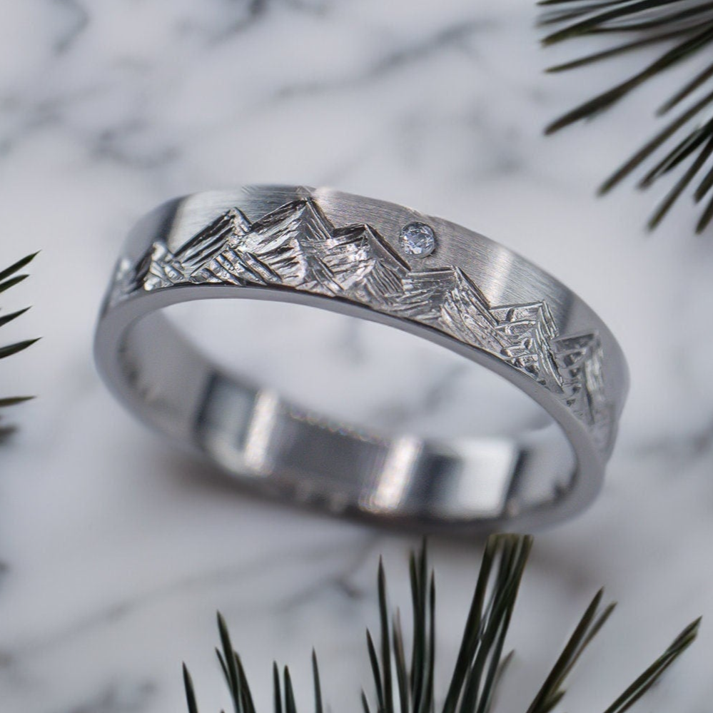 A breathtakingly beautiful 4mm ring with a hand-carved mountain range encircling it. Each mountain is uniquely crafted, no two are alike! 1 - 1.3mm lab-created diamond sits between the peaks.